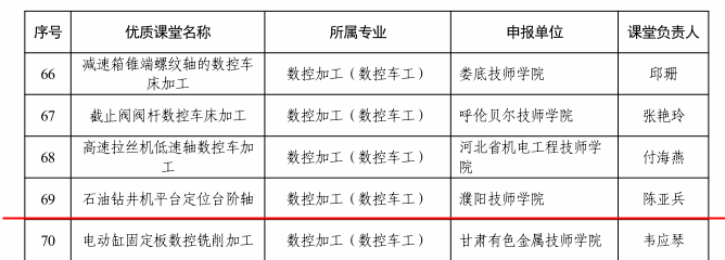 近日,人力资源和社会保障部办公厅公布了《技工院校工学一体化技能人才培养模式优质课堂名单》。经院校申报、省级遴选和专家评审,我院陈亚兵老师负责的《石油钻井机平台定位台阶轴数控车床加工》、张行平老师负责的《一汽大众捷达汽车充电指示灯亮故障检修》成功入选,获评国家级优质课堂!